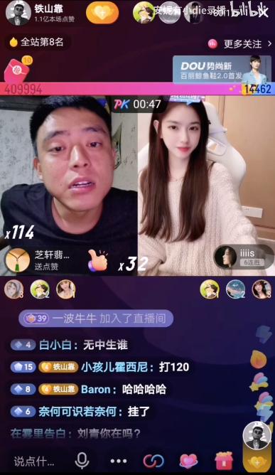其次,pk连麦有特色。网友们喜欢看铁山靠连麦pk,尤其是和美女主播的pk,鲜明的对比和pk成绩的差距,不仅直播效果爆炸,更可以形成后续的长尾传播,让铁山靠和参与pk的主播们共同受益。