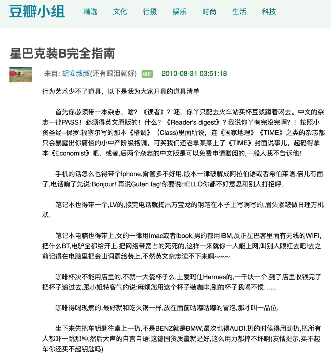 2010年,一份《星巴克完全装B指南》在豆瓣疯传,从着装、携带的书籍、电子设备,到支付方式、打电话的语言等等,指南中都有详尽的说明。