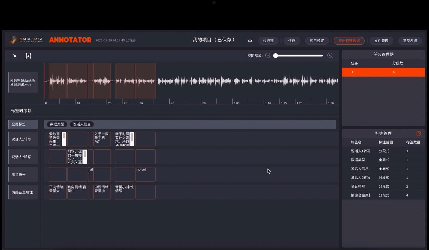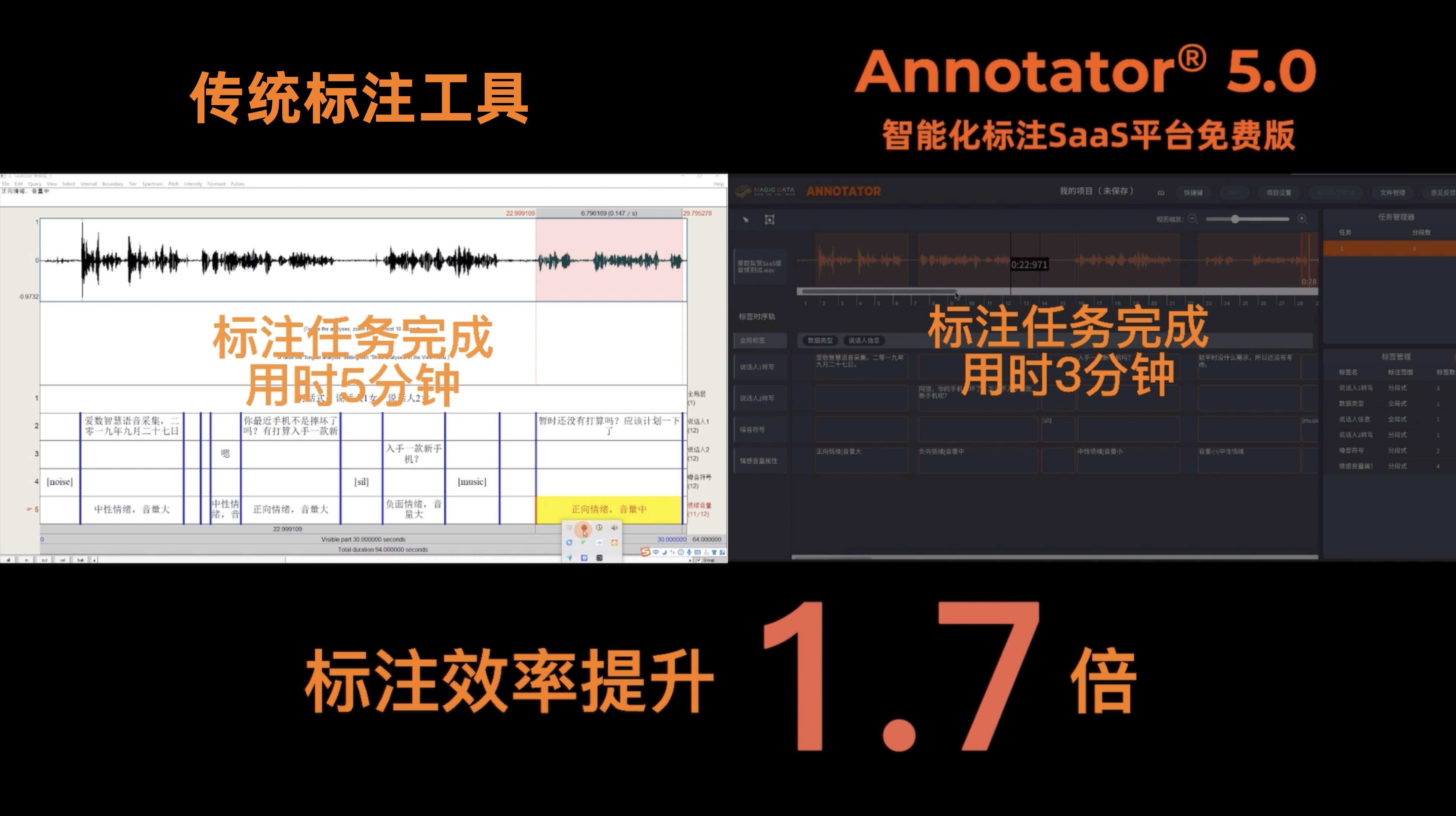 对于AI开发者和科研工作者来说,在标注特定的数据用于AI模型训练时,离不开数据标注工具的加持。目前,市面上可选的免费数据标注工具有限,为避免复杂操作导致学习成本较高,界面体验不佳影响标注效率等,Annotator® 5.0 智能化标注SaaS平台免费版进一步聚焦基础功能,操作界面设置了音轨区、标注区、功能区、任务管理区和标签管理区五大区域。相比传统标注工具,SaaS平台免费版提升大约1.7倍的标注效率。平台进一步保证核心功能流畅和突出,简洁高效,从而轻松实现标注自由。