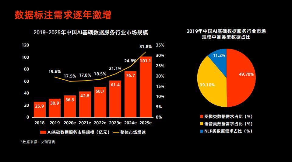 在AI商业化不断加快的背景下,数据市场规模也不断扩大,据艾瑞分析《2020年中国AI基础数据服务行业发展报告》显示,2019年中国AI基础数据服务行业市场规模达到30.9亿元,其中语音类数据需求规模占比为39.1%,预计到2025年数据市场规模将突破100亿元,年化增长率21.8%。