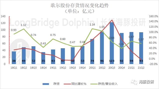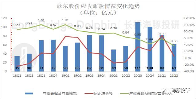 1)应收账款: 2021年二季度应收账款及票据61亿元,同比增长5.9%,环比下滑26.1%,占收入比例下降到0.38。歌尔股份在逐部承接组装业务的同时,公司应收账款周转逐季改善。