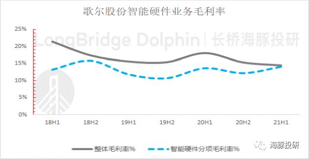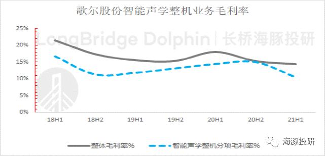 歌尔股份智能声学整机板块2021年上半年毛利率10.5%,同比下滑3.9pct。