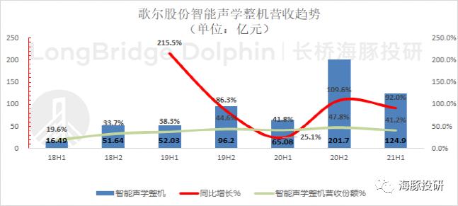 歌尔股份智能声学整机板块2021年上半年总营收124.9亿元,同比增长92%。