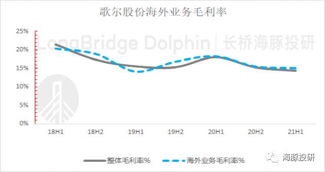 歌尔股份海外业务2021年上半年毛利率15.1%,同比减少3.2pct,环比减少0.4pct。