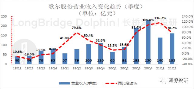 歌尔股份2021年第二季度总营收162.6亿元,同比增长78.7%,超市场预期(158.8亿元)。在Oculus、AirPods和PS等产品出货增长的情况,公司收入规模成长迅速。