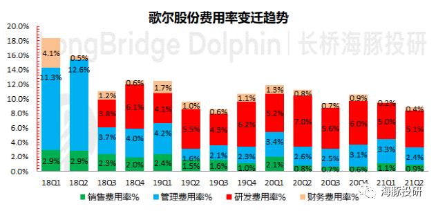2021年二季度歌尔股份四项费用合计14.41亿元,同比增长41.14%,环比增长7.2%。四项费用率8.9%,同比下降2.3pct,环比下降0.7pct。