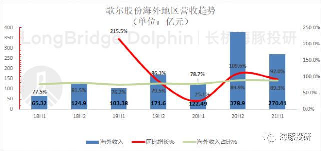 歌尔股份海外业务2021年上半年总营收270.41亿元,同比增长92%,收入占比89.3% 。