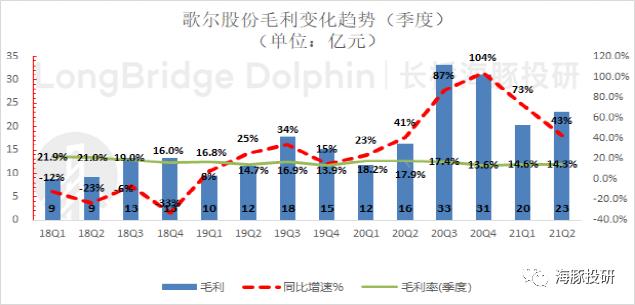 歌尔股份2021年上半年毛利润43.65亿元,同比增长55.4%。上半年整体毛利率14.4%,比去年同期下滑3.4pct,主要是由于相对低毛利率的组装业务增加结构性拉低了毛利率。