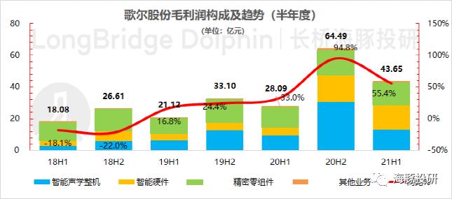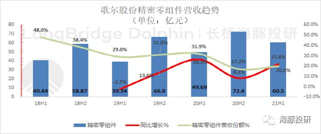 歌尔股份精密零组件板块2021年上半年总营收60.5亿元,同比增长21.8%。