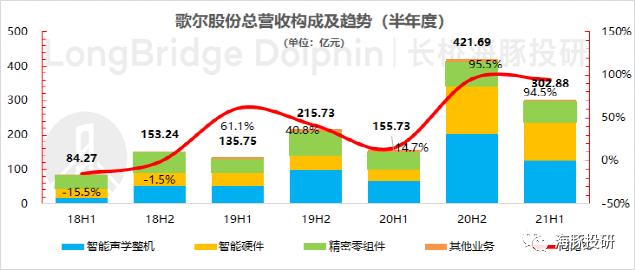 歌尔股份2021年上半年总营收302.88亿元,同比增长94.5%。