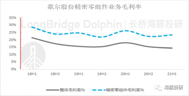 歌尔股份精密零组件板块2021年上半年毛利率23.4%,同比减少2.8pct,环比增长1.1pct。