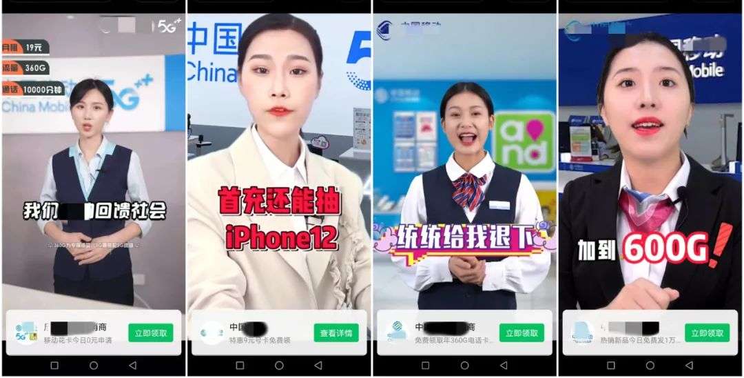有老板模样的人气愤地对镜头大喊,招呼你如何1元卖手机,或者是一个干练的职场女性,霸气地对镜头说“某运营商回馈社会,19元申请免流量卡”。
