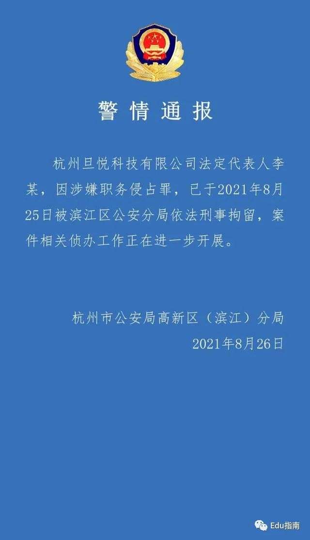8月26日,据杭州市公安局滨江区分局官微警情通报,杭州旦悦科技有限公司法定代表人李某,因涉嫌职务侵占罪,于2021年8月25日被滨江区公安分局依法刑事拘留,案件相关侦办工作正在进一步开展。