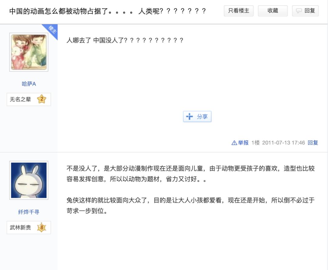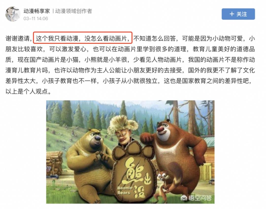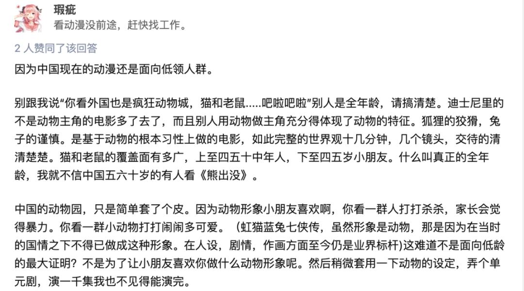 比如在知乎、贴吧上搜索问题“为什么中国的很多动画片都是以动物来做主人公的?”,高赞答案基本都集中在“国内动画产业对动画片理解太狭隘”的范围内。