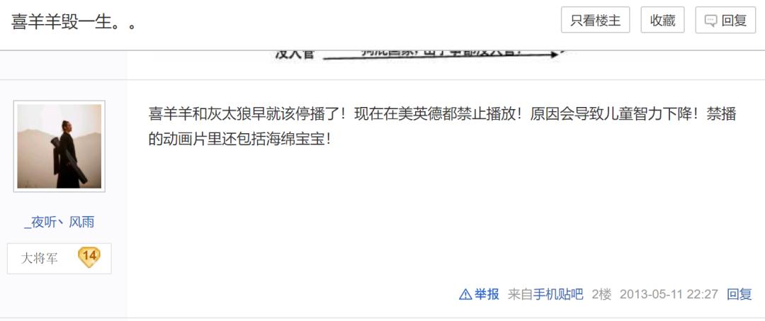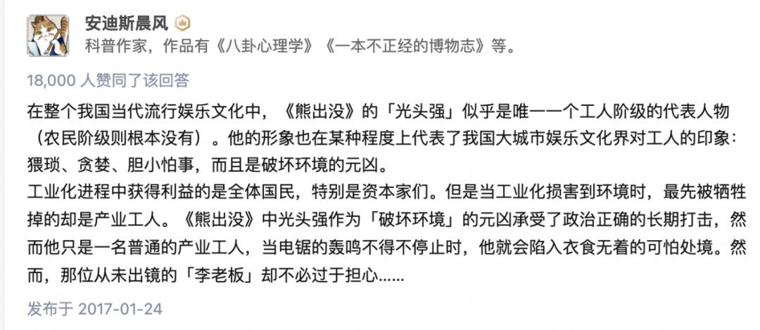 对童年作品再次做出阐释则更多发生在《喜羊羊与灰太狼》以及《熊出没》上。在知乎“为什么说熊出没是一部很残酷的动画片?”的问题里,可以看到很多为光头强发声正名的人,在他们的回答中,光头强是社会最底层的工人,被老板拖欠工资,过年回家要么没钱要么连买点年货的钱都拿不出,好不容易买彩票中了还被两只熊给抢了。