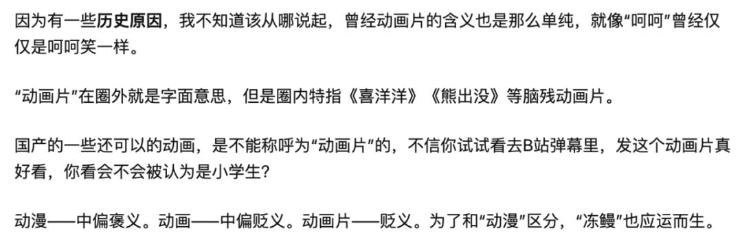 在对国漫、动物世界以及子供番之间纠葛的讨论中,还慢慢产生了一个经典的伪命题,或者叫鄙视链:只有中国的叫动画、动画片,海外的才有资格叫动漫,动漫一词慢慢地也比动画高级一等——一个直观例证是为了防止名字上的歧义(包括舆论上的争议),B站一度将“国漫区”改名为“国创区”。