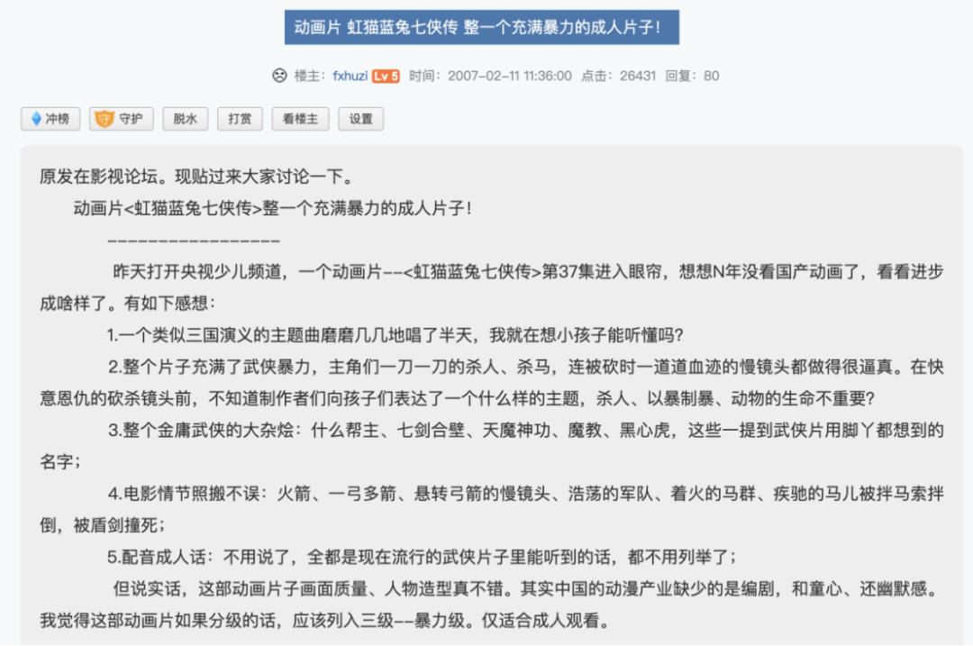 2007年初——那时的《虹猫蓝兔七侠传》开播还不到一年——天涯论坛里出现了一个神贴:一位家长认为电视里播放的动画片是“暴力”(一群混混打打杀杀)且“充斥不文明词汇”的(比如从马三娘嘴里说出的那句“贱人”),呼吁人们对播放平台(央视)进行投诉。