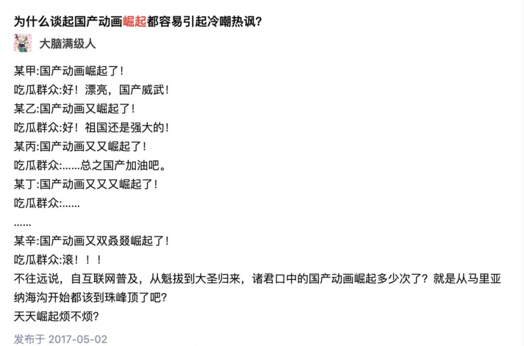 那么我们怎么去理解这种主动把国产动画降维的情绪?为什么会产生这种情绪?谁推动了这样的情绪产生?