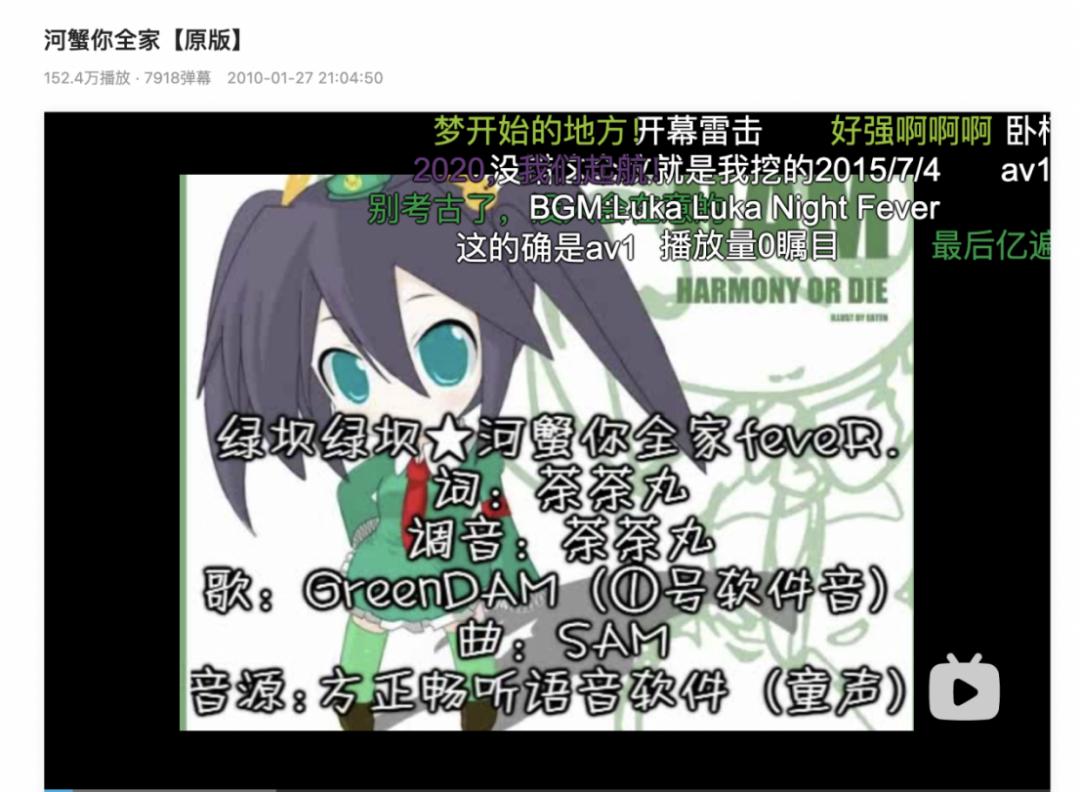 这种全是槽点且自诞生之日就显得定位非常混乱的软件,自然也逃不掉被恶搞的下场。在绿坝推出不到一个月的时间,“绿坝娘”这一同人创作就已经诞生,成为中国本土鬼畜文化标志性人物。B站在Mikufun时期上传的番号为av1的视频,正是讽刺绿坝的《绿坝绿坝★河蟹你全家feveR.》,并且在av1变成投稿公告栏之后,不断有人重新将其上传,并经常以“文物修复”、“考古”来进行修饰。