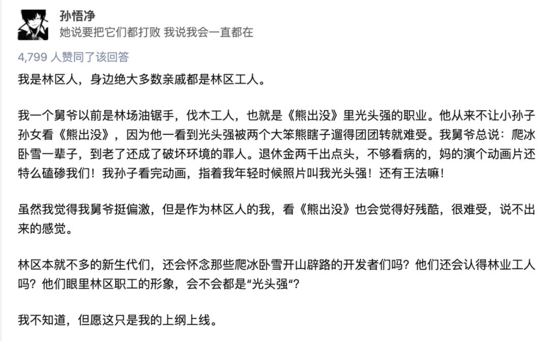 在这背后,还有更深层次的对于上世纪伐木工人悲惨境遇的讨论——他们劳苦半辈子,最后背上“破坏生态”的骂名,所得工资也只够仅仅维持生存,如果没有《熊出没》,可能这个群体已经快被人忘记了。
