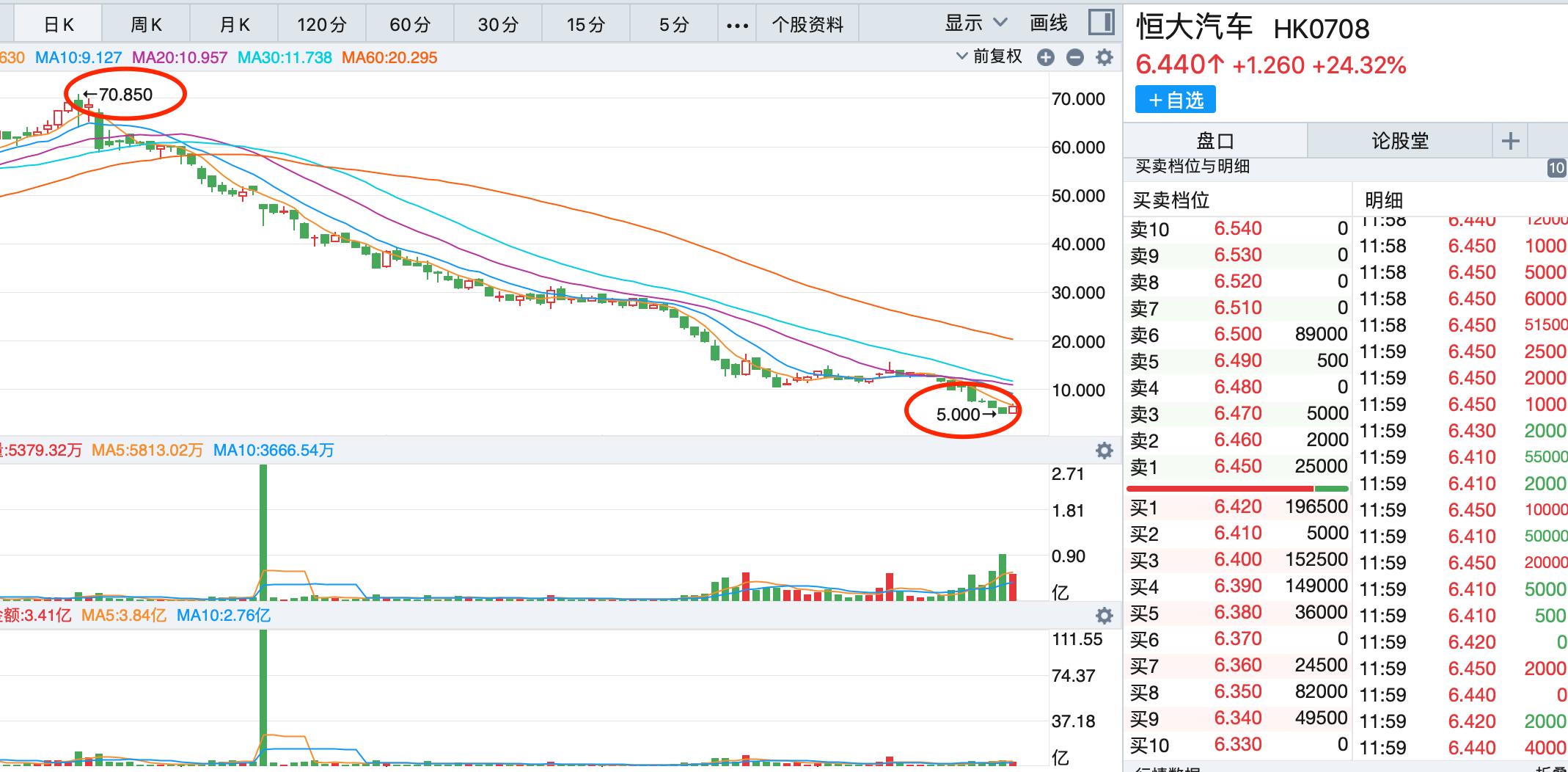 从股价表现看,恒大汽车自今年4月起呈现一路下跌情况。去年6月12日,恒大汽车股价是7.13港元,到今年2月17日报72.25港元,市值逾7000亿港元,8个月涨了10倍。但今年4月21日开启暴跌模式,8月26日收5.18港元,相比高点下跌超过90%。