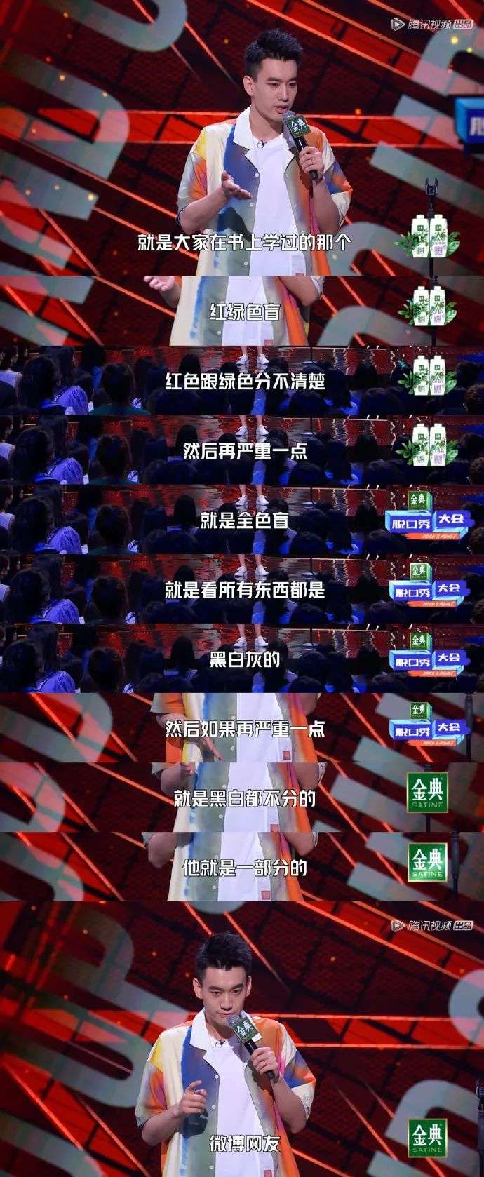 8月25日晚上,# 庞博 黑白不分的是一部分网友 # 冲上微博热搜第三。起因是在新一季《脱口秀大会》的主题赛中,他称自己有黄绿色弱,并用色觉障碍来比喻部分网友:比红绿色盲更严重的是看什么都只有黑白灰的全色盲,比全色盲更严重的是黑白都不分的一部分微博网友。