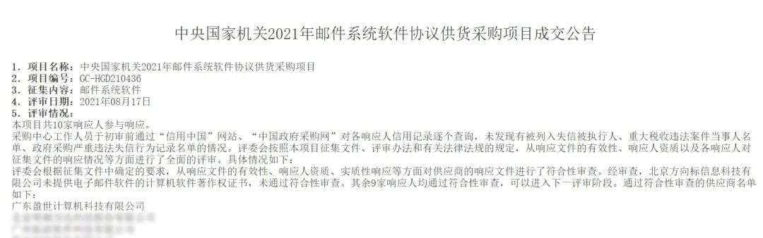 近日,《中央国家机关2021年邮件系统软件协议供货采购项目成交公告》发布,Coremail邮件系统成功中标,再次入选!