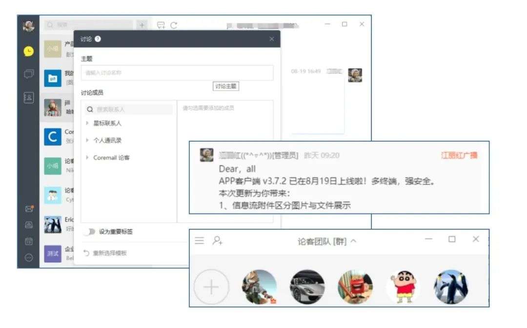 根据不同需求和不同对象,选择多样的会话场景。支持建立私聊、讨论、广播、群,匹配不同的交流模式。