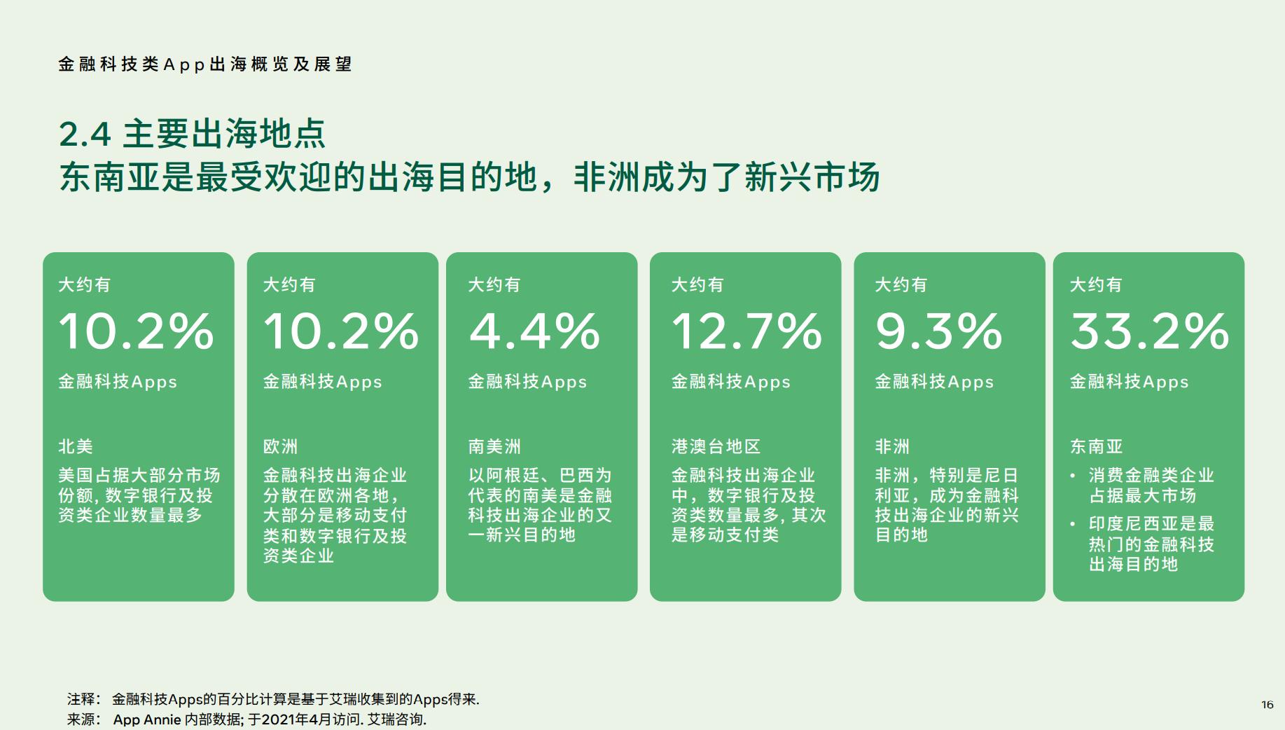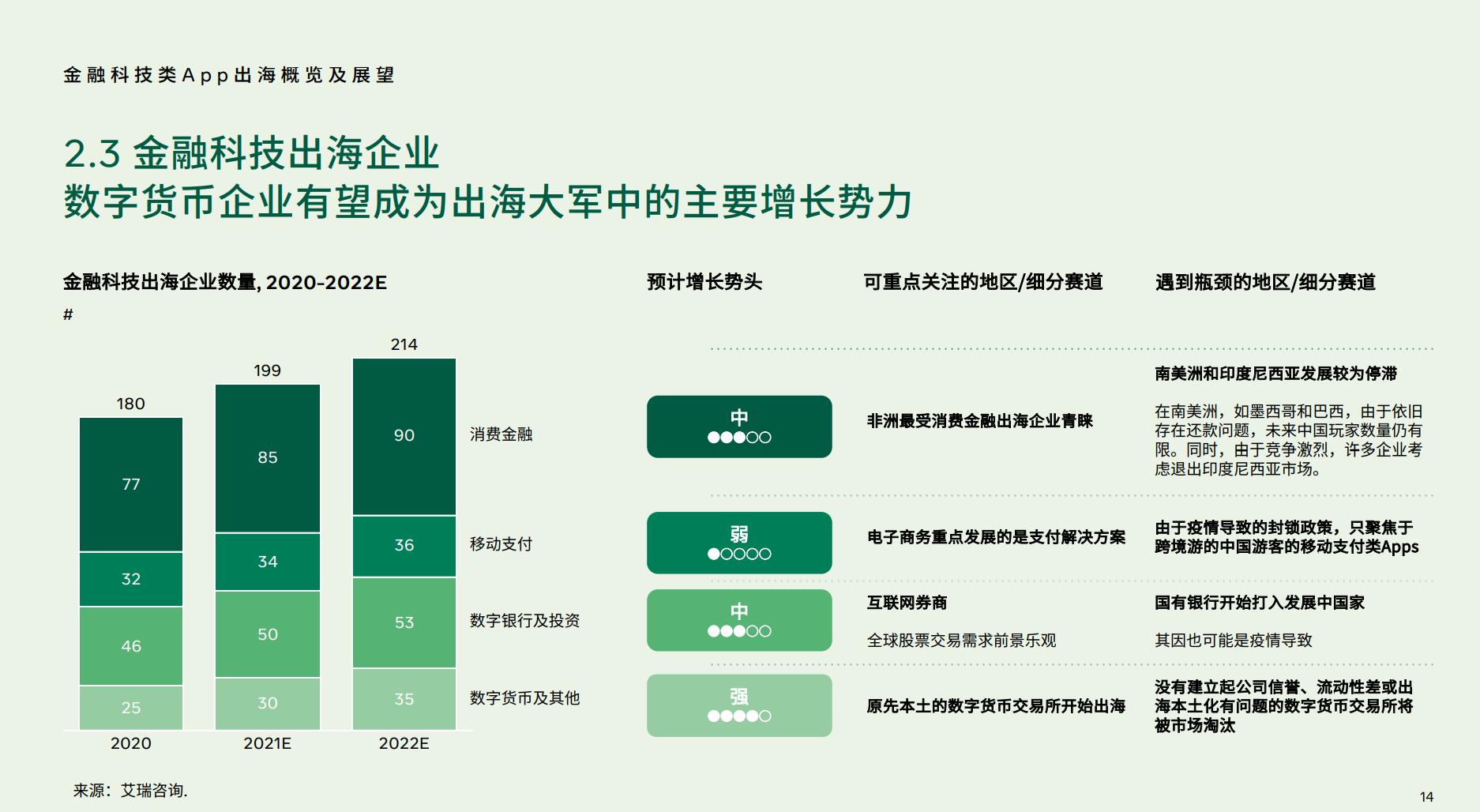 与此同时,海外市场对金融科技的应用需求也在快速迭代,相关垂直领域的创新焦点的变化值得中国出海APP密切跟踪。例如,对于消费金融类 APP,海外用户希望进一步简化融资申请流程并且提高可触达性。对于移动支付,如何通过特定场景下的激励手段促使消费者使用 APP 交易是关键所在。对于数字银行及财富管理,海外用户则希望此类 APP 可以在不稳定的市场环境下提供安全保障。2020年以来,全球各地也涌现出诸多新的金融产品和服务方案,为中国金融科技出海带来了竞争和挑战。