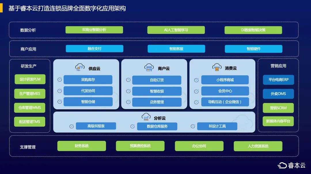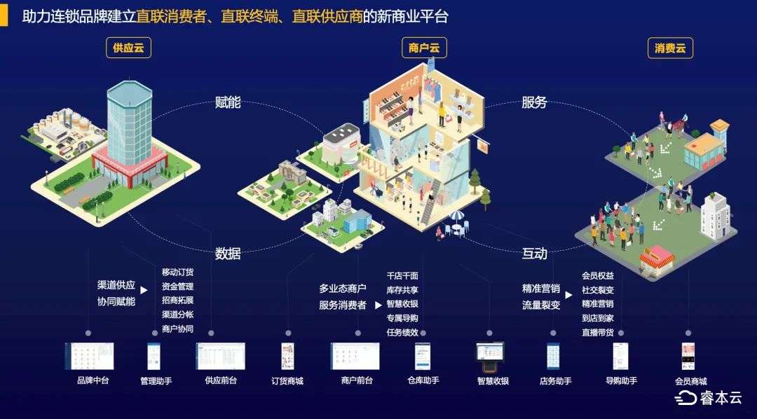 睿本云通过消费云、商户云、供应云实现品牌直连消费者、终端商户、供应商。同时睿本云还沉淀出基于消费大数据的分析云以及可高度扩展的aPaaS技术平台等,帮助大中型连锁品牌建立在新商业领域深度应用数字化的能力。