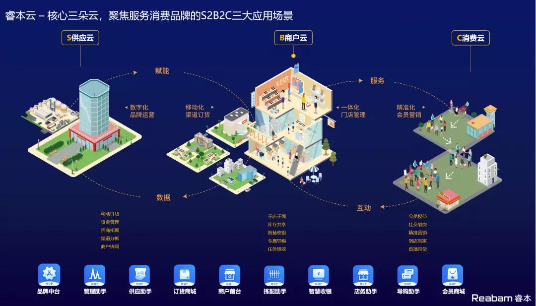 而睿本云一体化系统支撑创新的品牌S2B2C数字化运营模式,通过消费云、商户云、供应云及分析云等应用云场景,实现产业供应一体化,分销零售一体化,多业态一体化,线上线下一体化,将品牌供应协同、仓储加工、渠道分销、连锁门店、导购互动与会员流量等等所有环节的业务全部打通,并进行会员、商品、销售及订货等多维度分析,为品牌运营做出智能决策支撑。