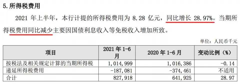 这个业绩看起来不错,且该行净利润还是在所得税费用增长的前提下保持了两位数增长。数据显示,2021 年上半年,该行计提的所得税费用为8.28 亿元,同比增长28.97%。