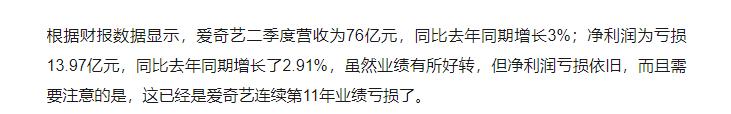 在辉煌的用户数据背面,隐藏的是视频平台难以盈利的事实。根据爱奇艺最新发布的第二季度财报显示,爱奇艺总营收达到了76亿元,同比增长3%,与此同时,爱奇艺净亏损为14亿元,依旧保持在去年的同期水平。根据金融机构分析,爱奇艺这么长久的亏损很可能会持续下去,暂时看不到盈利的边界。