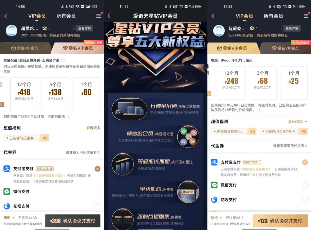 不仅如此,爱奇艺甚至为痴迷追剧的用户推出了全新的“星钻VIP”会员服务,包月价格为60元,是涨价后的“黄金VIP”价格的2.5倍。至于该会员主打的权益,最吸引人的自然是“超前点播”和“星钻影院”。