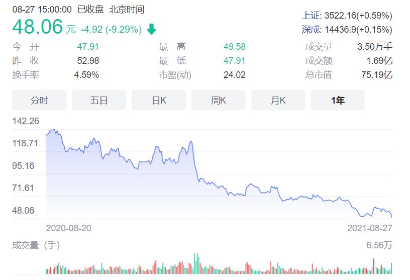 除了财报的不理想,小熊的大盘走势近一年来一直是肉眼可见的低迷状态。2019年挂牌上市后市值飙涨4倍、超220亿元的风光持续不长,从最高点的165.9/股跌至最低点的49.24/股,即使相比较于8月27日的收盘价48.06/股,跌幅超60%,市值蒸发近100亿元。