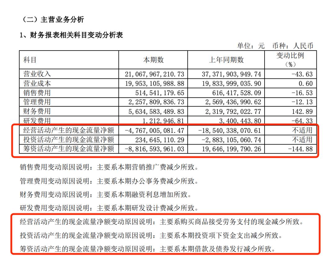 同时,筹资已经变得非常困难,由于借款和发行债券困难,导致筹资活动的现金流量净额是负88.16亿元,同比下滑145%。