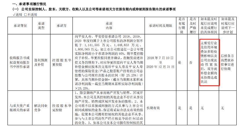 2017年入股华夏幸福的同时,双方签订了一个业绩对赌协议,其中约定华夏幸福2018-2020三年的归股净利分别不低于114.15亿元、144.88亿元、180亿元,如果华夏幸福三年中的任一会计年度实际利润小于承诺净利润的95%,则需要对中国平安进行分红之外的补偿。