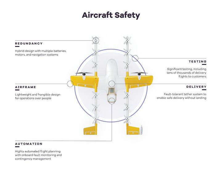 为了尽可能降低无人机意外坠落对人的伤害,Wing 的机身用了泡沫材料包裹,并且重量很轻。