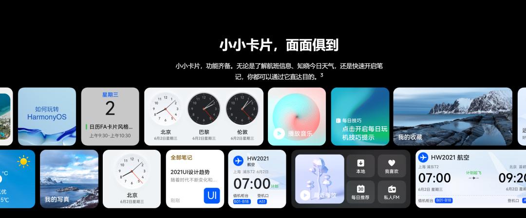首先,可能是因为系统内核不同的缘故,EMUI 12并不支持HarmonyOS 2系统特有的万能卡片功能。备受好评的万能卡片不仅可以个性化展示与用户高度相关且必要的信息,还允许用户直达应用内部的各种服务,在简化手机操作体验的同时,让用户得以打造具有个人风格的桌面。