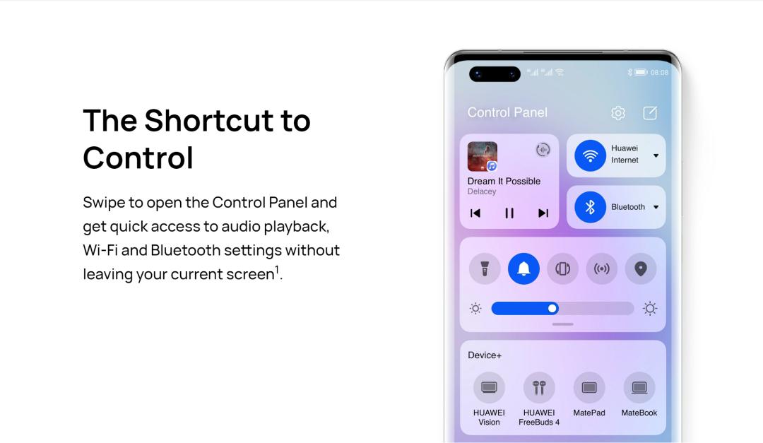 除开UI设计,EMUI 12还继承了一些来自鸿蒙系统的创新和备受好评的功能点。EMUI 12获得了新的控制中心面板,用户在该界面不仅可以轻松访问音频控制、常用的蓝牙和Wifi设置,甚至还能直接调动周边设备,瞬间启动多屏协同,流转大屏观影,连接音箱听歌。