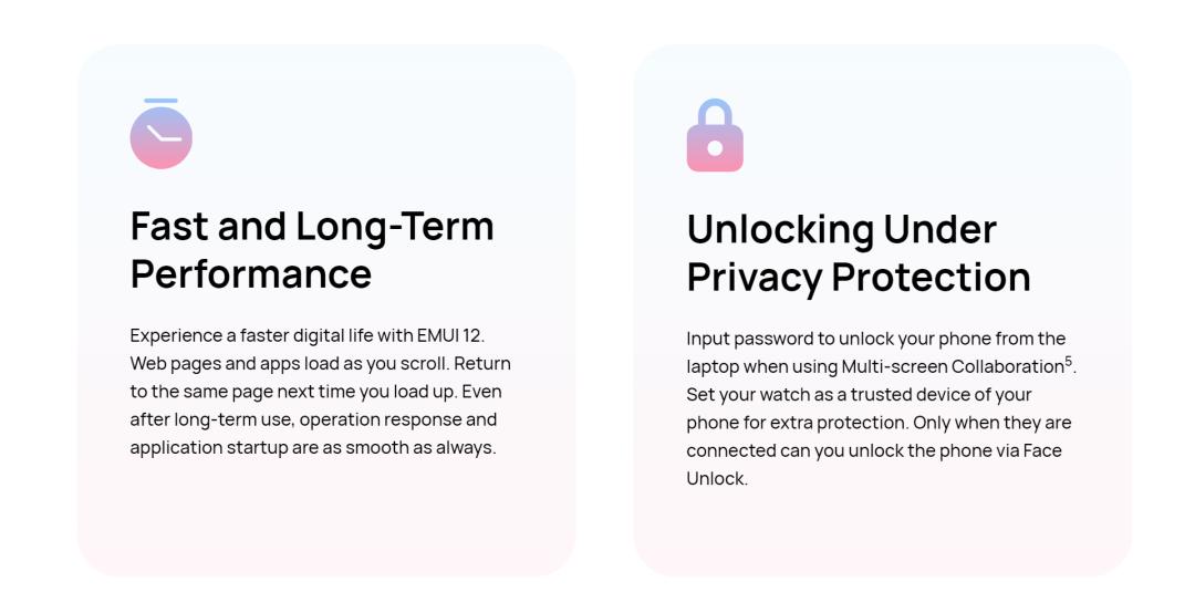 最后,EMUI 12还强调了一下性能、安全方面的改进。性能方面,华为承诺EMUI 12,不惧设备老化,即便长期使用手机,应用程序和手机流畅度依然保持不变。安全方面,EMUI 12现在支持用户在多屏操作时,在电脑或笔记本上通过输入密码解锁手机,或是将智能手表设置为可信任设备来解锁手机。