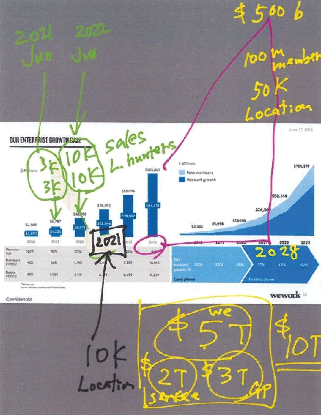 这样一份夸张的增长计划,并没有吓到孙正义。相反,他认可了诺伊曼「做增长」的思路。他在诺伊曼「五年计划」的基础上,进一步为 WeWork 规划了一份「十年增长计划」。孙正义认为,到 2028 年,WeWork 应该拥有超过 1 亿名租客,主营业务收入实现 5000 亿美元。
