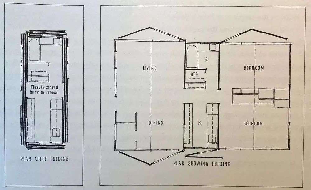 整个房屋或许面积过大,难以运输,但如果将房屋做成可折叠式,折叠后仅仅 8 英尺宽(连航运都能接受的尺寸),再到现场摊开组装呢?