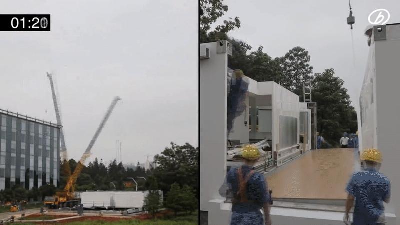 ▲Board 组装预制房屋过程. 图片来自:YouTube @SkyCity
