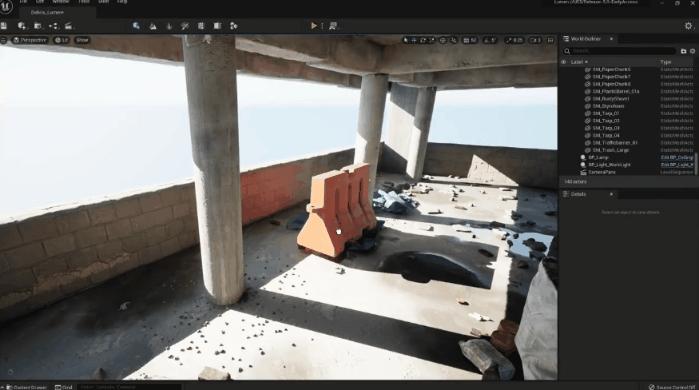 另外在开发过程中,物体对光照的相应也是动态且全局化的,譬如在这个画面中,阳光从外部照射进来,此时放入一个水马,光线照在水马表面进行漫反射,反射出的红色光线又打在混凝土墙面上,有了如此立体的光线反馈,才能让人觉得这个画面足够真实。