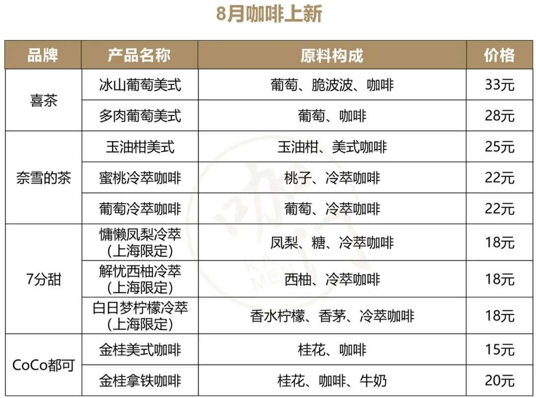 8月,共有4个茶饮品牌推出咖啡:喜茶、奈雪的茶、7分甜、CoCo都可,产品价格在15~33元区间;其中价格最低的是CoCo的金桂美式咖啡,15元;价格最高则为喜茶的冰山葡萄美式,价格33元。