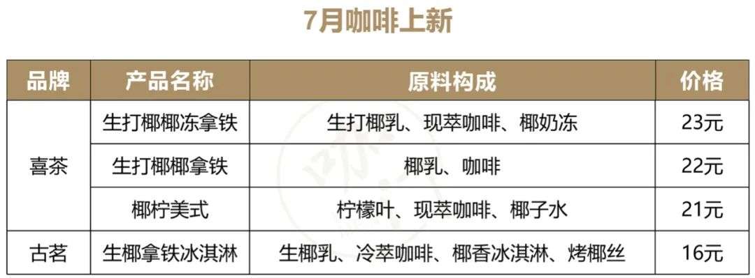 7月,也有2个茶饮品牌推出咖啡:喜茶上新3款生打椰咖啡,古茗推出1款生椰拿铁冰淇淋。