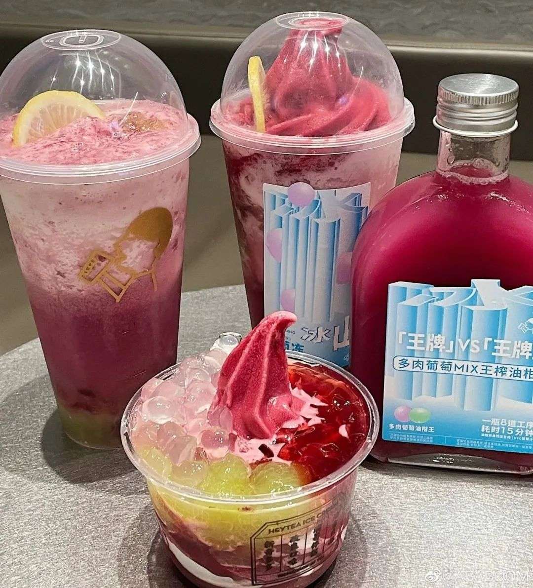 喜茶推出的冰山葡萄冻,顶部是葡萄雪芭,中间是可尔必思、绿妍与NFC果汁打成的葡萄冰沙,底部是葡萄果肉及葡萄冻、新鲜柠檬片。可尔必思、葡萄雪芭、葡萄冻、柠檬片都是新加入的原料。