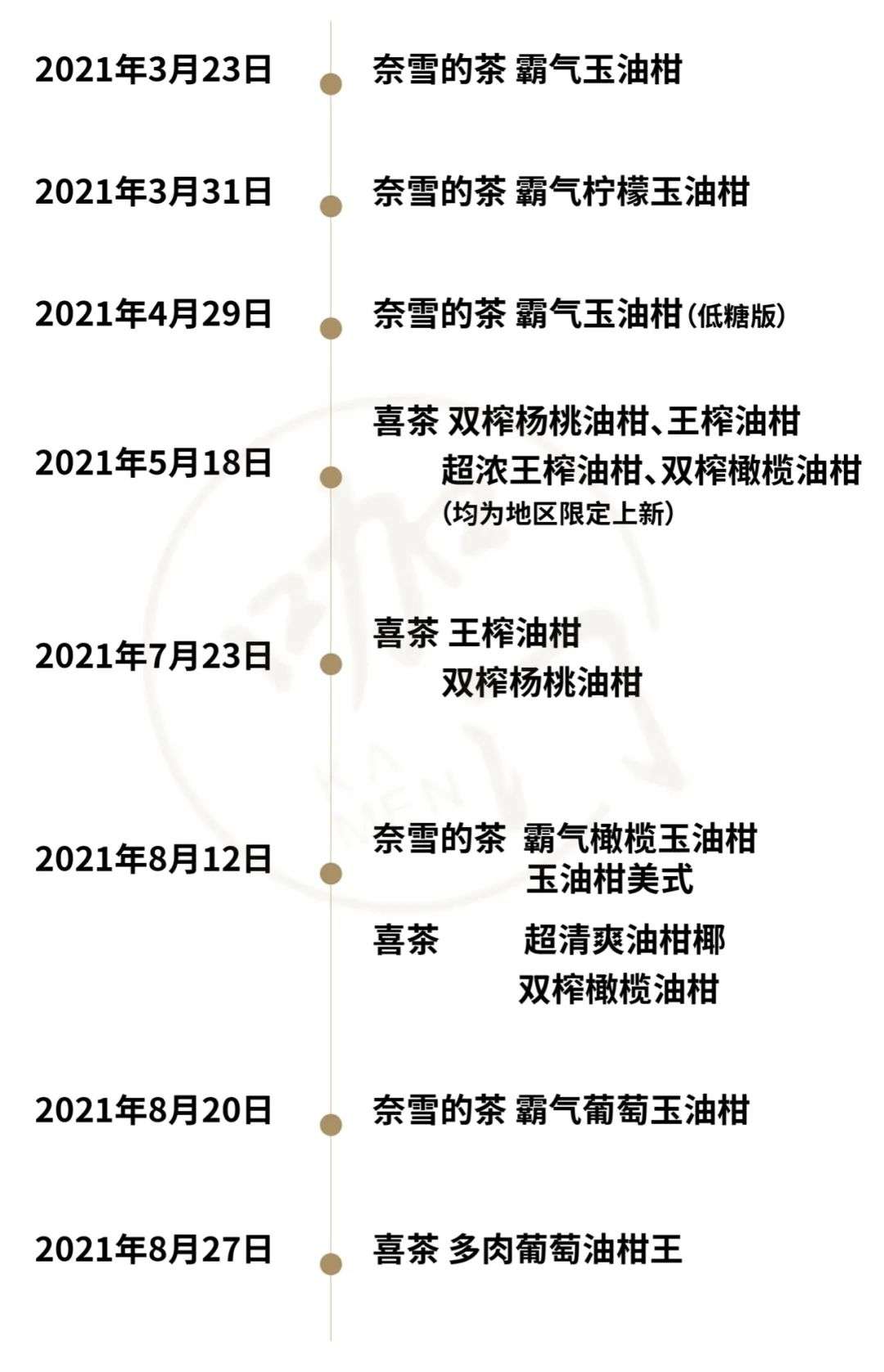 7月23日喜茶全国上新王榨油柑、双榨杨桃油柑;8月12日,全国上新双榨橄榄油柑、超清爽油柑椰;8月27日,全国上新多肉葡萄油柑王。