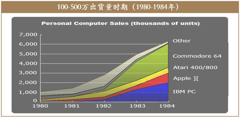 随着整体芯片算力的进步和成本的下降,市场更加蓬勃爆发,80年代初期以C64电脑为标志,500+元美金使其成为了史上最畅销的PC之一,年出货量高达200-300万台。